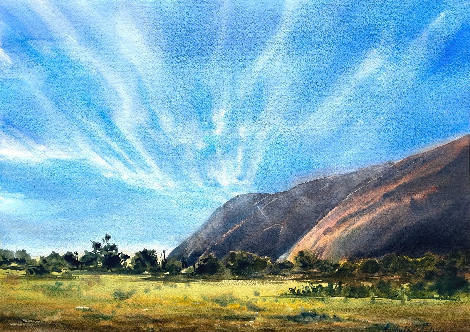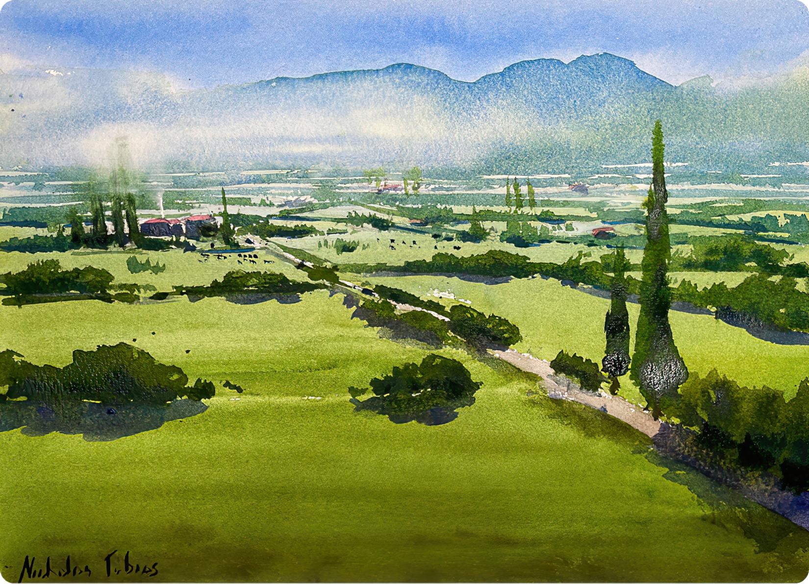 In this lesson, we’ll be painting a peaceful rural scene inspired by the quiet, sunlit landscapes of Cyprus. It’s a beautiful place with soft rolling hills, distant mountains, and warm golden fields.