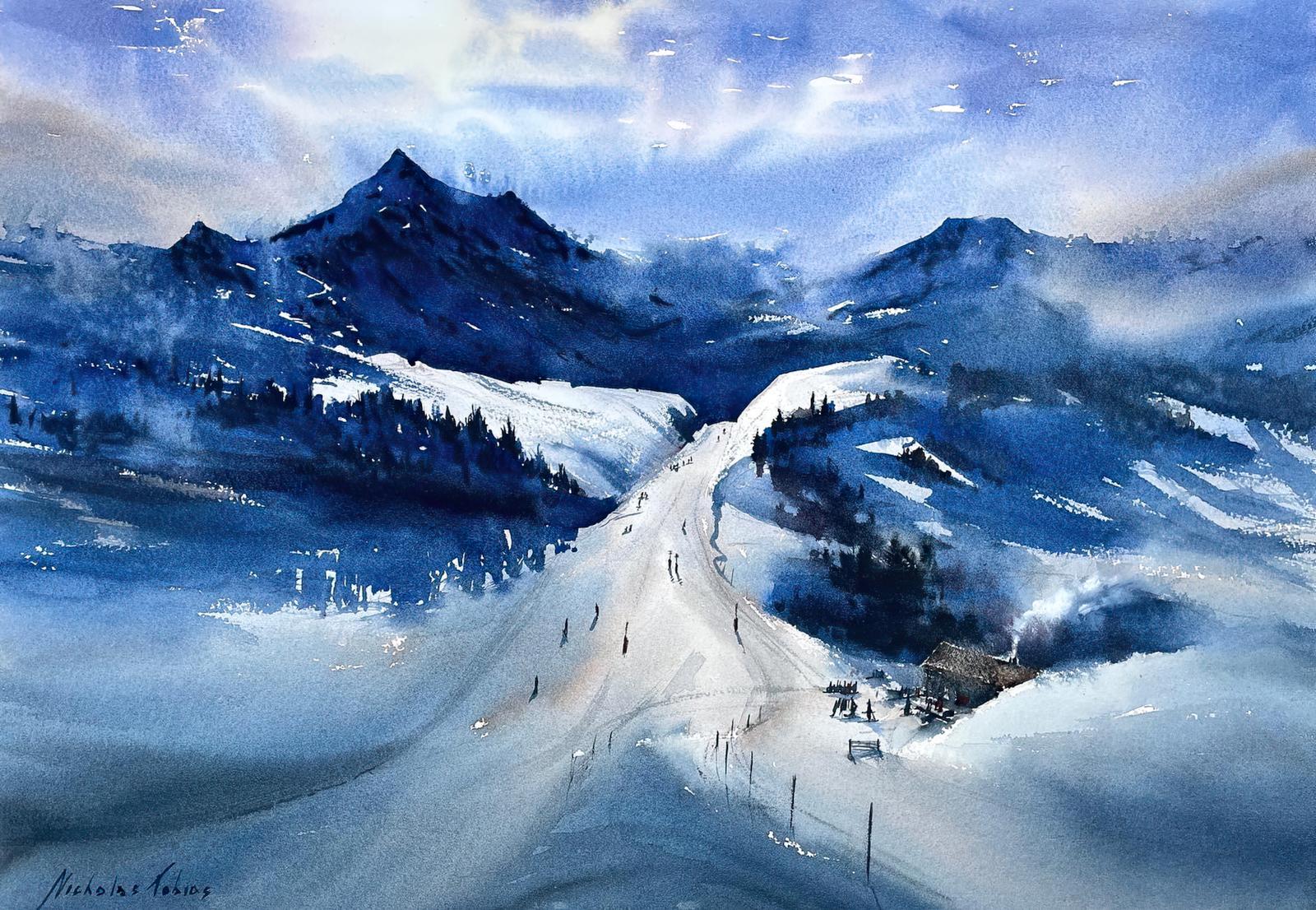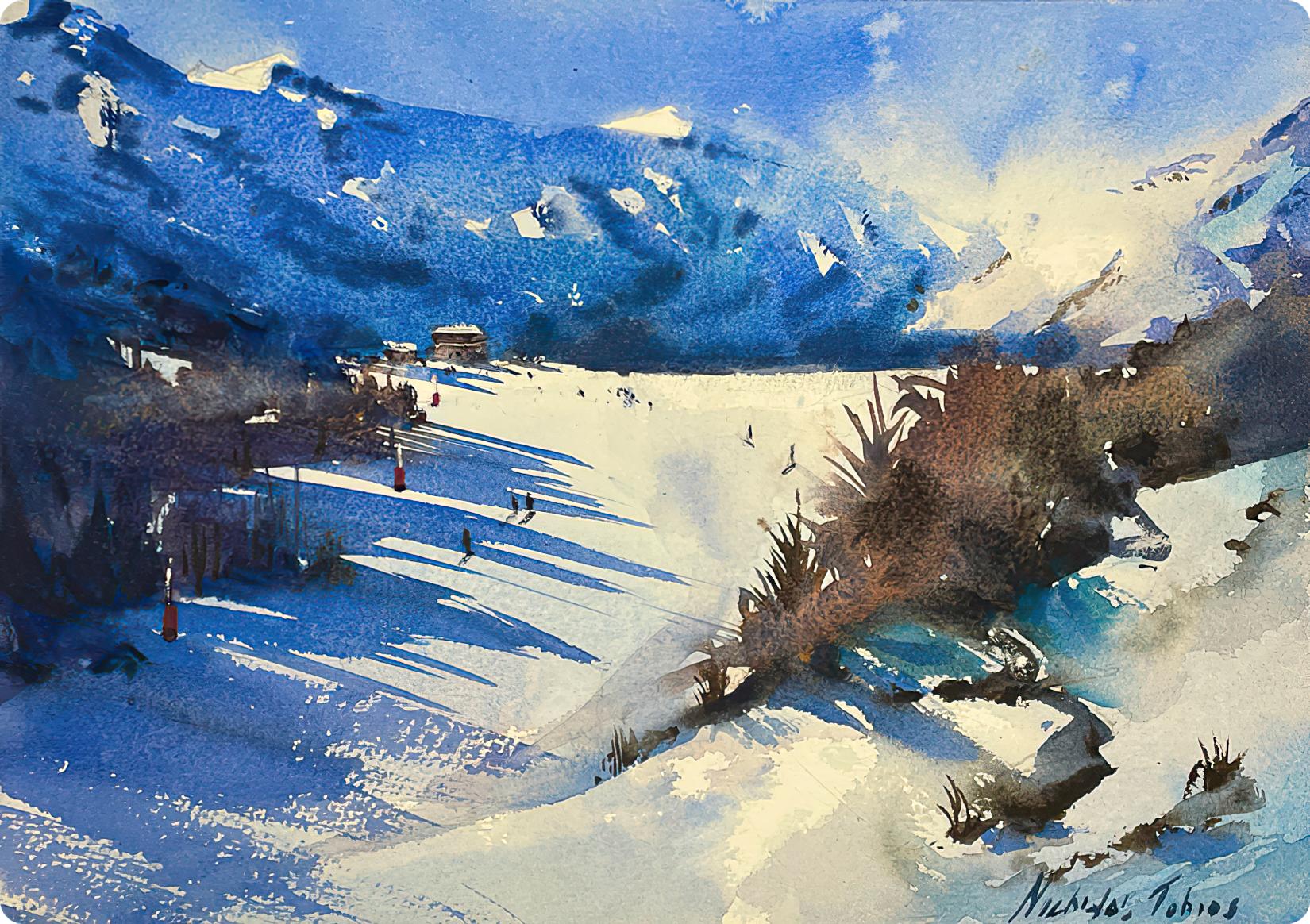 A quiet winter journey to Auron, where snow-dusted peaks, hushed chalets, and soft alpine light unfold in delicate washes of watercolor.